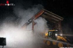 Mit umluftunabhängigen Atemschutz wurde die Brandbekämpfung aufgenommen. Wertvollen Dienst beim Ausräumen des Hackschnitzellagers leisteten zwei Bagger. Damit konnten neben dem Gebäude das Stückgut aufgeschüttet und abgelöscht werden. Der Einsatz mit dem Hackgut ausräumen dauerte mehrere Stunden.