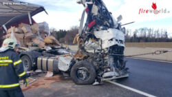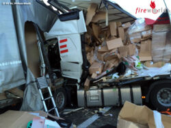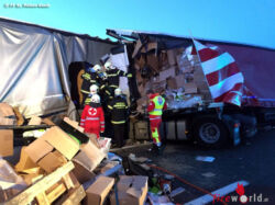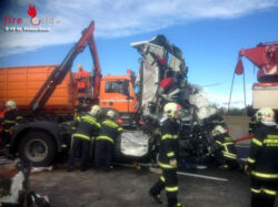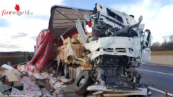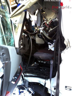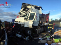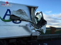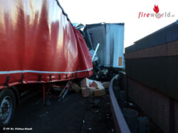 Der Lenker des aufgefahrenen Lkw wurde in der völlig deformierten Fahrerkabine des Unfallfahrzeuges eingeklemmt. Er musste unter Einsatz zweier hydraulischer Rettungssätze aus dem Wrack befreit werden.