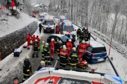 KERNHOF (NÖ): Am Samstag dem 16. Jänner 2016 kurz nach Mittag kam es zu einem schweren Verkehrsunfall mit mehreren eingeklemmten Personen bei der Ortstafel Kernhof, aufgrund des Lagebildes wurde die Alarmstufe T3 alarmiert, sechs Feuerwehren wurden alarmiert. Auch die Rettungsdienste alarmierte neun Rettungsmittel.
