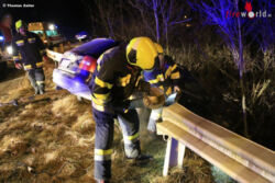 "Nachdem das Fahrzeug mittels Seilwinde gegen ein weiteres Abrutschen gesichert wurde, mussten von den 12 eingesetzten Feuerwehrmännern die beiden Leitplankenteile, die sich ein Stück in die Fahrer und Beifahrertüre gebohrt hatten, mittels Trennschleifer entfernt werden", schildert Einsatzleiter Christoph Wieser. Da an der Einsatzstelle nur zwei Personen aufgefunden wurden, der Lenker jedoch angab, dass sich im Pkw vier Personen befanden, wurde neben den Bergearbeiten als Unterstützung der Polizei eine Suchaktion mit Wärmebildkamera gestartet. In weiterer Folge hat die Polizei die Ermittlungen übernommen, während die Feuerwehrkräfte abrücken konnten.