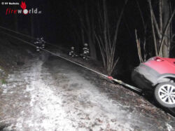 Gleichzeitig wurde durch die LAWZ auch das Kranfahrzeug der Berufsfeuerwehr Klagenfurt alarmiert. Nach einer Lageerkundung durch Einsatzleiter OBI Scheucher Friedrich und dem Fahrzeugkommandant des Kranes stand fest, dass eine Bergung mittels schwerem Gerät nicht möglich ist. Somit wurde das KRFS Reifnitz mit Greifzug und Anschlagmaterial nachgefordert. Auf Grund der erhöhten Verletzungsgefahr durch den vereisten Weg wurden die Kammeraden mittels Feuerwehrgurt und Seile gesichert, während sie den Greifzug und die Umlenkung aufbauten. Nach ca. 2 Stunden konnte das Fahrzeug erfolgreich aus dem Graben geborgen und dem Fahrzeugbesitzer übergeben werden.