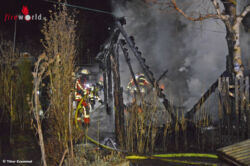 Bei den Nachlöscharbeiten musste die noch bestehende Rahmenkonstruktion zum vollständigen ablöschen niedergerissen werden. Mit der Wärmebildkamera wurden letzte Glutnestern gezielt abgelöscht. Wie es zu dem Brand kam ist noch unklar. Es entstand ein Sachschaden in unbekannter Höhe. Die Polizei hat während der Löscharbeiten die Ermittlungen bereits aufgenommen.