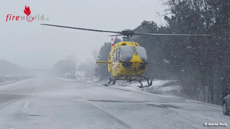 Durch die sehr gut organisierten parallel laufenden Tätigkeiten während des Einsatzes wurde zu diesem Zeitpunkt eine sichere Aufstiegshilfe über die Böschung aufgebaut. Die Patientin wurde mit einem Spineboard aus dem Fahrzeug gehoben und mit der Korbschleiftrage über die Böschung gerettet. Oben angekommen befand sich gerade der aus Wien kommende Notarzthubschrauber Christophorus 9 im Landeanflug. Während mit dem eingetroffenen Arzt die Patientin im Rettungswagen genauer untersucht wurde, konnte das verunfallte Fahrzeug mit der Seilwinde näher zur Fahrbahn gezogen werden und anschließend mit dem Ladekran auf das LAST Leobersdorf verladen werden. Der Einsatz konnte nach knapp zwei Stunden beendet werden.