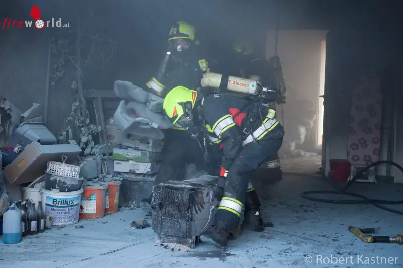 Die eintreffenden Feuerwehrkräfte fanden vor Ort einen Rauchaustritt aus der Haustür des Wohnhauses vor, was auf offene Türen bis in die Garage zurückzuführen gewesen ist. Ein Atemschutztrupp führte daraufhin per Hochdruckrohr einen Löschangriff über den Hintereingang der Garage durch. Mehrere gelagerte Gegenstände brannten, konnten jedoch rasch abgelöscht werden. Im Anschluss daran wurde das vom Brand betroffene Gut im erforderlichen Ausmaß aus der Garage geräumt und abgelagert. Nach etwas mehr als einer Stunde konnten die Feuerwehren Alkoven und Polsing wieder einrücken und den Einsatz beenden.