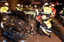 MÜNCHEN (BAYERN): Am späten Dienstagabend, 26. Jänner 2016, hat eine junge Frau in Allach die Kontrolle über ihren BMW 428i verloren. Sie geriet mit dem Wagen in das rechte Bankett, schleuderte nach links, berührte dort einen Laternenmast und knallte dann an einen Alleebaum. Das Fahrzeug drehte sich um die eigene Achse und blieb total deformiert liegen.
