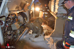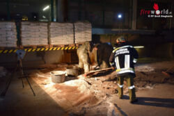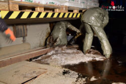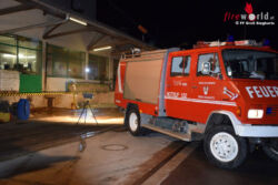 Bei der Ankunft bot sich folgende Lage: Bei Abfüllarbeiten kam es zu einer Überfüllung des Heizöltanks mit Heizöl leicht. Zwei Mann rüsteten sich mit Schutzbekleidung aus. Das ausglaufene Heizöl leicht wurde mit Ölbindemittel bestreut, der noch angeschlossene Füllschlauch abmontiert. Danch wurden Holztafeln aufgelegt, damit keine Ölspur gezogen werden konnte, wenn der Tankwagen rückwärts wegfuhr. Das mit Bindemittel aufgesaugte Material wurde in einen Container gefüllt, danach die Ölflecken mit Bioversal besprüht und mit dem Hochdruckrohr weggewaschen. Der Klärmeister von diesem Einsatz in Kenntnis gesetzt. Nach zwei Stunden war der Einsatz beendet.