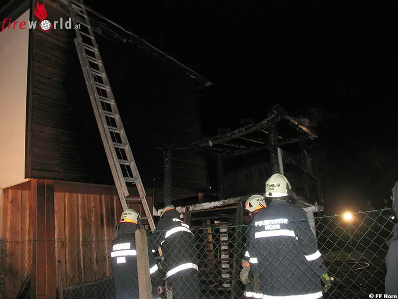 Mit der Drehleiter wurde aus Richtung Stadtpark eine Beleuchtung aufgebaut. Die nachrückenden Feuerwehren stellten die Löschwasserversorgung sicher bzw. unterstützten die Feuerwehr Horn bei den Löscharbeiten. In weiterer Folge musste ein Teil der Holzverschalung entfernt werden, um weitere Glutnester abzulöschen. Die Wärmebildkamera leistete bei diesem Einsatz beste Arbeit.