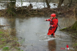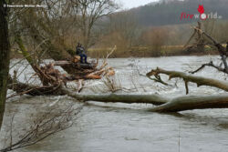 Einsatzkräfte der DLRG näherten sich der Person über einen im Wasser liegenden Baumstamm und konnten ihn zumindest so mit einer Leine sichern. Auch mit den vorhandenen Rettungsgeräten der Feuerwehr konnte die Person nicht erreicht werden.