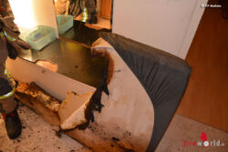 Beim Eintreffen wurden wir von der Bewohnerin eingewiesen und informiert, dass sich keine Personen mehr in der Wohnung befinden. Die Erkundung des Einsatzleiters ergab einen Brand im Kinderzimmer im oberen Teil einer Maisonettewohnung. Aufgrund des Rauchaustrittes und der vermuteten thermischen Aufbereitung des Raumes, sowie der Länge des Angriffsweges wurde umgehend ein Löschangriff mittels eines C-Hohlstrahlrohrs in Verbindung mit einem Schlauchpaket und eines Schlauchtragekorbes durch den Atemschutztrupp des Tanklöschfahrzeuges 1 angeordnet. Vorsorglich wurde ein Drucklüfter vorbereitet und in Stellung gebracht, um ggf. das Stiegenhaus rauchfrei zu halten. Der Rettungstrupp wurde durch die Pumpe 1 gestellt. Durch die Drehleiter wurde eine Anleiterbereitschaft vorbereitet, welche jedoch nicht benötigt wurde. Die Löschmaßnahmen brachten relativ schnell den gewünschten Erfolg und so konnte nach kurzer Zeit Brand unter Kontrolle gemeldet werden. Nach Freigabe durch die Beamten der Polizei wurde der Brandschutt ins Freie gebracht, eine Kontrolle mittels der Wärmebildkamera und Nachlöscharbeiten durchgeführt.