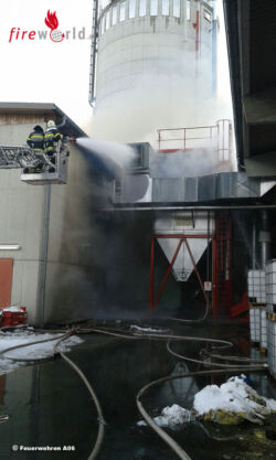 AU BEI GAISHORN (STMK): Kurz nach 10.00 Uhr heulten am 5. Februar 2016 erstmals die Sirenen bei der BTF Mayr Melnhof in Au bei Gaishorn. Eine Entstaubungsanlage mit angeschlossenem Hochsilo fing aus noch unbekannter Ursache Feuer.