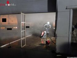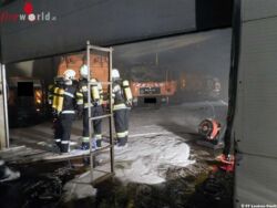 Unverzüglich rückte die Feuerwehr zu diesem Brandereignis aus. Bei der Erkundung der ersteingetroffenen Einsatzkräfte stellte sich heraus, dass es zu einem Brand in einer Fahrzeughalle gekommen war. Unverzüglich wurde ein Innenangriff unter umluftunabhängigen Atemschutz mit einem HD-Rohr vorgetragen.