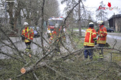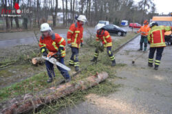 Um 17:51 Uhr wurden die Floriansjünger zunächst in die Goethestraße alarmiert. Dort war ein größerer Baum umgefallen und versperrte die Straße. Beim Eintreffen der Feuerwehr hatten bereits Bewohner der Straße, begonnen den Baum zu beseitigen. Die Feuerwehr unterstützte die Arbeiten mit Hilfe einer Motorkettensäge. Von dort aus ging es für die Einsatzkräfte gleich weiter in den Sohlweg. Dort versperrte ein etwa 8 Meter langer entwurzelter Baum die Zufahrtsstraße zur Sohlsiedlung. Auch dieser Baum konnte mit der Motorkettensäge beseitigt werden, so dass die Zufahrt wieder geleistet werden konnte. Zwischenzeitlich meldete die Feuerwehrleitstelle eine dritte Einsatzstelle im Mauertal. Daraufhin ließ Einsatzleiter Feuerwehrkommandant Günther Sebold nochmals Alarm für die Feuerwehr Weingarten auslösen, um weitere Kräfte nachzuziehen. Im Mauertal versperrte ein ungefähr 12 Meter großer Baum die Fahrstraße. Der gewaltige Baum hatte beim Fall einen weiteren Baum in Mitleidenschaft gezogen. So musste auch dieser Baum beseitigt werden, da die Gefahr bestand das dieser auch noch umstürzen könnte. Bei den beiden Einsatzstellen Sohlweg und Mauertal wurde die Feuerwehr vom Bauhof Weingarten unterstützt. So wurde der Bereich im Sohlweg vom Bauhof abgesperrt und im Mauertal wurde bei der Beseitigung des Windwurfes mit einem Radlader unterstützt. Die Feuerwehr Weingarten war mit 10 Einsatzkräften bis ca. 20 Uhr im Einsatz. Vom Bauhof Weingarten waren 2 Mitarbeiter im Einsatz.