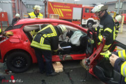 ALSFELD / RÜSSELSHEIM (DEUTSCHLAND): Mit der Rettungsschere zu Opel: Die Alsfelder Feuerwehr absolvierte am Samstag, 13. Februar 2016, ein Seminar zur technischen Hilfeleistung im südhessischen Rüsselsheim. Auf dem über fünf Quadratkilometer großen Gelände des Automobilherstellers wurde Alsfelds Unfallrettern bei der Werkfeuerwehr die neueste Fahrzeugtechnik vorgestellt, dazu zählten automatische Notrufsysteme sowie wasserstoffangetriebene Autos. Die Ausbilder der Werksfeuerwehr zeigten zudem verschiedene Rettungstechniken an Unfallfahrzeugen und demonstrierten die Grenzen von Einsatzgeräten der Feuerwehr.