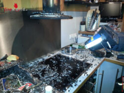 Als die Hausbesitzerin den Brandgeruch war nahm, eilte Sie sofort in die Küche. Aus dem Topf schlugen bereits Flammen und hatten den Dunstabzug, die Küchenschränke, sowie Dekorationsgegenstände in Brand gesetzt. Sie alarmierte sofort die Feuerwehr, nahm den brennenden Topf mit Tüchern und beförderte diesen ins Freie.