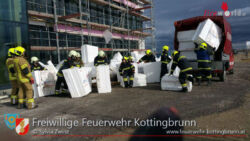 KOTTINGBRUNN (NÖ): Die auf einer Baustelle gelagerten Baumaterialen wurden in Kottingbrunn am 21. Februar 2016 vom Wind zu Boden gerissen und im gesamten CCK-Gelände verteilt. Am Einsatzort angekommen, wurden zuerst die herumfliegenden Styroporplatten mit dem LAST-Fahrzeug eingesammelt und in der angrenzenden Halle vor dem Wind geschützt abgelegt.