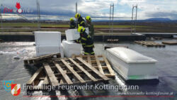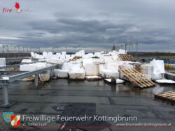 Die restlichen Mitglieder begaben sich inzwischen auf das Dach um die restlichen Styroporplatten zu Boden zu bringen, um ein Wegfliegen zu verhindern. Da auch schon mehrere Gasflaschen zu Boden fielen, wurden auch diese vom Dach getragen, um weitere Schäden zu verhindern.