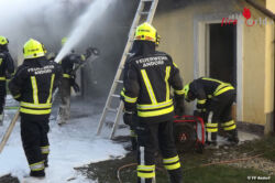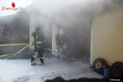 ANDORF (OÖ): Tiefschwarze Rauchschwaden empfingen die Feuerwehr bei der Anfahrt zu einem Garagenbrand in der Franz-Stelzhamer-Straße inmitten von Andorf am 24. Februar 2016.