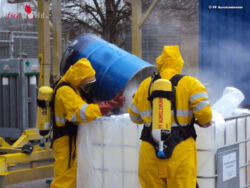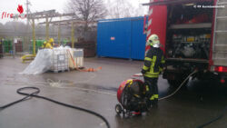 AUROLZMÜNSTER (OÖ): Um 12:36 Uhr wurde die Freiw. Feuerwehr Aurolzmünster am 25. Februar 2016 von einem ortsansässigen, metallverarbeitenden Betrieb zu einem Schadstoffeinsatz gerufen. Vermutlich durch unsachgemäße Lagerung begann in einem 200 Liter Fass Salpetersäure zu reagieren und beschädigte dieses soweit, dass es zu mehreren Leckagen kam.