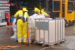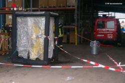 Weiters wurde die Feuerwehr vom Betrieb auf ein weiteres Fass, das sich in einem Gefahrengutcontainer befand und zu bersten drohte, aufmerksam gemacht. Um welchen Stoff es sich dabei handelt, war für die Feuerwehr nicht in Erfahrung zu bringen! Daraufhin wurde um das Fass eine Ex- Messung durchgeführt, welche keine erhöten Werte ergab.