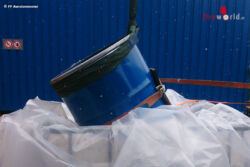 Mittels eines IBC Containers wurde ein provisorischer Auffangbehälter gefertigt. Anschließend wurde das mit Moosgummi und Ratschengurten provisorisch abgedichtete Fass in aufrechte Stellung gebracht, sodas ein gefahrenloses Öffnen möglich war. Die Saüre wurde unter Verwendung der Schutzstufe 2 mit schweren Atemschutz mittels einer Druckluftmembranpumpe in einen neuen IBC Container umgefüllt.