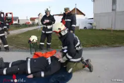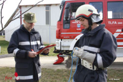 Im Anschluss der Überprüfung von Wissen in den Bereichen Erste-Hilfe, Knotenkunde, Gerätekunde, Schadstofflehre und Taktik musste ein simulierter Brandeinsatz abgearbeitet werden.
