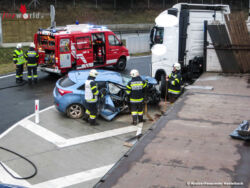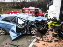 NESTELBACH BEI GRAZ (STMK): Aus bisher noch ungeklärter Ursache kam es Montagnachmittag, 29. Februar 2016, zu einem schweren Verkehrsunfall mit eingeklemmter Person auf der A2 Richtung Klagenfurt am Autobahnrastplatz Laßnitzhöhe Nord. Der Lenker verlor bei der Ausfahrt zum Rastplatz die Kontrolle über sein Fahrzeug und schleuderte über den Grünstreifen des Autobahnrastplatz und kollidierte frontal mit einem abgestellten LKW – Zug.