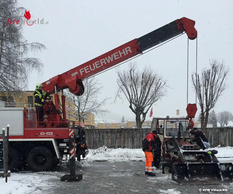 Den Einsatz des schweren Kranfahrzeuges forderte kurz darauf Vormittag ein Traktor, der bei Schneeräumarbeiten in unmittelbarer Nähe der Hauptfeuerwache Villach mit dem rechten Vorderrad in einem Kanalabfluss stecken geblieben war. Mittels des Krans wurde er das Fahrzeug angehoben und so wieder gängig gemacht.