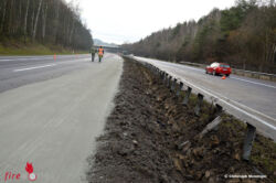 Großes Glück hatten der Lenker und die unmittelbar neben dem Lkw fahrenden Fahrzeuge, dass diese gerade noch ausweichen konnten. Der tschechische Lenker konnte den Lkw auf die linke Seite, dem Pannenstreifen lenken und dort abstellen. Die Mittelleitschiene wurde schwer deformiert. Der Lkw sank im aufgeweichten Erdreich fast 50cm ein und verschmutzte mit der Erde noch zusätzlich die beiden Fahrstreifen.