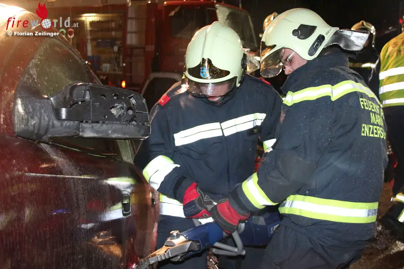 Nach rund 25 Minuten waren beide Personen aus dem Fahrzeug befreit und wurden von zwei Kameraden betreut. Während der Menschenrettung begann in unmittelbarer Nähe ein Auto zu brennen. Mittels Hochdruck-Rohr vom Tanklöschfahrzeug wurde dieser Brand unter umluftunabhängigem Atemschutz bekämpft. Um alle Glutnester zu beseitigen, wurde die Motorhaube mit dem Akku-Kombigerät geöffnet. Nachdem mittels Ladekran des Schweren Rüstfahrzeuges (SRF) der verunfallte Pkw von der Mauer gehoben war, konnten die 21 Mitglieder mit fünf Fahrzeugen wieder einrücken.