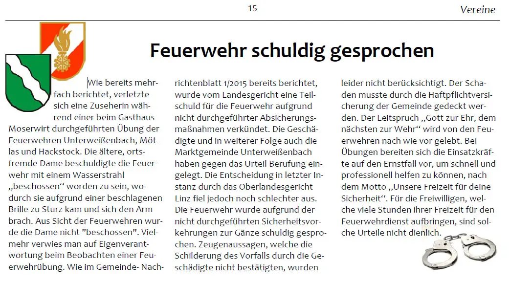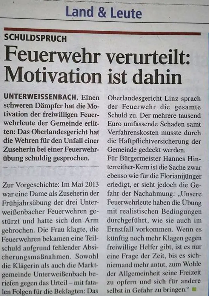 UNTERWEISSENBACH (OÖ): Seit kurzem kurisert auf den sozialen Netzwerken eine Zeitungsmeldung über eine Verurteilung der Feuerwehr Unterweißenbach (Oberösterreich) nach der Klage einer Frau nach einer Feuerwehrübung.