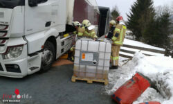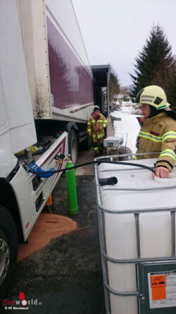 Der Lenker eines Sattelzuges wollte bei einem Lebensmittelgeschäft Ladetätigkeiten durchführen. Als er mit seinem Fahrzeug die Laderampe befuhr, riss er sich durch die starke Neigung den Treibstofftank auf. Durch den Einsatzleiter der Feuerwehr Bichlach, Kdt. Grandner Sebastian, wurde die Feuerwehr Kirchdorf mit der Ölwehr nachgefordert.