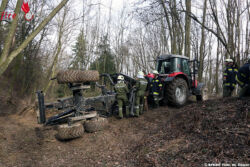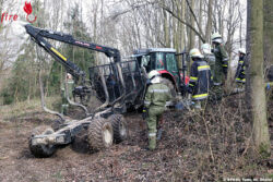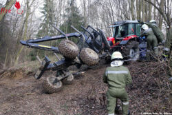 Ein Landwirt war mit seinem Traktor mit Rückewagen in einem Hohlweg unterwegs. Als er in einen anderen Weg abbiegen wollte, kippte der Anhänger um. Der Forstwagen lag in einer so ungünstigen Stellung dass es sich mit dem eigenen Abstützarm nicht mehr hochstellen konnte. Der Bauer alarmierte daraufhin die Einsatzkräfte.