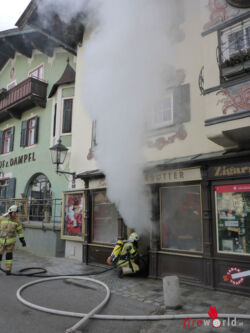 ST. JOHANN (TIROL): Um 10.11 Uhr wurde die Feuerwehr St. Johann am 7. März 2016 per Pager und Sirene von der Leitstelle Tirol zu einem Gebäudebrand Wohngebäude am St. Johanner Hauptplatz alarmiert. In einem Schuhgeschäft in der St. Johanner Fußgängerzone war es zu einem Brand gekommen.