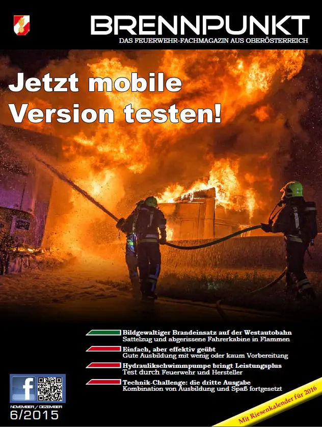 Das Partner-Feuerwehrfachmagazin Brennpunkt arbeitet daran, das vollwertige Heft demnächst auch in elektronischer Form als Abo anbieten zu können. Die Herausgeber haben den ersten Testschritt unternommen und die Ausgaben 6/2015 (Dezember) und 1/2016 (Feber) elektronisch ausgearbeitet und als Mobilversion bereitgestellt.