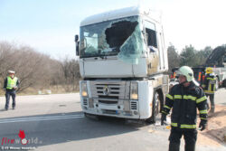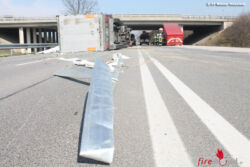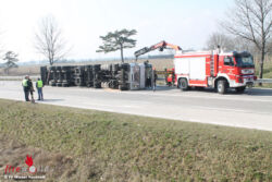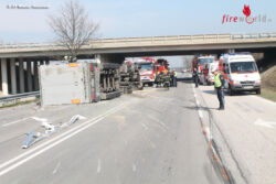 WIENER NEUSTADT (NÖ): Zur Stunde – 10. März 2016, 14.15 Uhr – befinden sich etwa zwei Dutzend Einsatzkräfte der Feuerwehr Wiener Neustadt auf der B54 bei Wiener Neustadt nach einem schweren Verkehrsunfall im Einsatz. Ein Lkw war bei der Abfahrt von der S4 auf der B54 ins Schleudern geraten und umgekippt. Die Beifahrerin musste mit dem Notarzthubschrauber ins Krankenhaus geflogen werden.