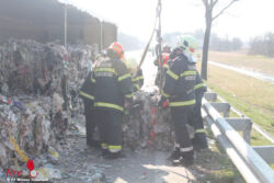 Um den Sattelzug zu bergen, muss erst die Ladung entfernt werden. Dabei unterstützt uns der Bauhof der Gemeinde Wiener Neustadt mit zwei Lkws. Danach wird der Sattelaufleger aufgerichtet und abtransportiert. Die B54 muss für die gesamte Dauer des Einsatzes zwischen der A2 und S4 Auffahrt komplett gesperrt werden.