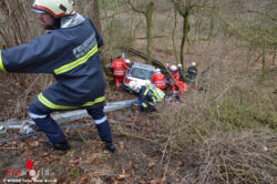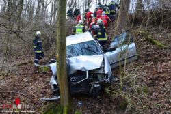 KATZELSDORF (NÖ): Ein Fahrzeug stürzte am 10. März 2016 im Wienerwald bei Katzelsdorf (Bez. Tulln) Richtung Paussauerhof über zehn Meter über eine Böschung ab und krachte letztlich gegen einen Baum.