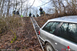 Nach dem Abtransport des verunglückten Ehepaares und der Unfallaufnahme durch die Polizei barg die Feuerwehr das verunglückte Fahrzeug. Zum Abschluss mussten noch die restlichen Wrackteile über das steile Gelände geborgen werden.