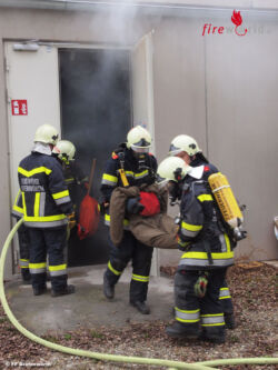 Vor Ort wurde unmittelbar nach der Erkundung durch den Einsatzleiter LM Daniel Zehetner ein Atemschutztrupp zur Menschenrettung in das Heizwerk geschickt. Mittels der s.g. „Wandtechnik“ konnte die dort versteckte Übungspuppe trotz des sehr verwinkelten und künstlich verrauchten Innenraums rasch gefunden und ins Freie verbracht werden. Anschließend wurde der Brand, welcher sich auf den Hackschnitzelbunker ausgebreitet hatte, von der Wartungsöffnung am Dach des Objekts mit einem Strahlrohr bekämpft und verschiedene Möglichkeiten getestet den Heizraum, trotz fehlender Abluftlöffnung, mittels Druckbelüfter zu ventilieren.