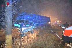 HORNDORF (DEUTSCHLAND): Zu einem folgenschweren Frontalzusammenstoß mit tödlichem Ausgang kam es in den frühen Morgenstunden des 14.03.2016 auf der Bundesstraße 216 zwischen der Ortschaft Horndorf und dem Reinstorfer Kreuz. Nach derzeitigen Ermittlungen war ein 51 Jahre alter Fahrer eines Kleintransporters Daimler Pritschenwagen gegen 04:45 Uhr auf dem Weg in Richtung Lüneburg aus bisher ungeklärter Ursache auf die Gegenfahrspur gefahren und kollidierte dort bei dichtem Nebel (Sicht unter 50 Metern) mit einem entgegenkommenden Sattelschlepper.