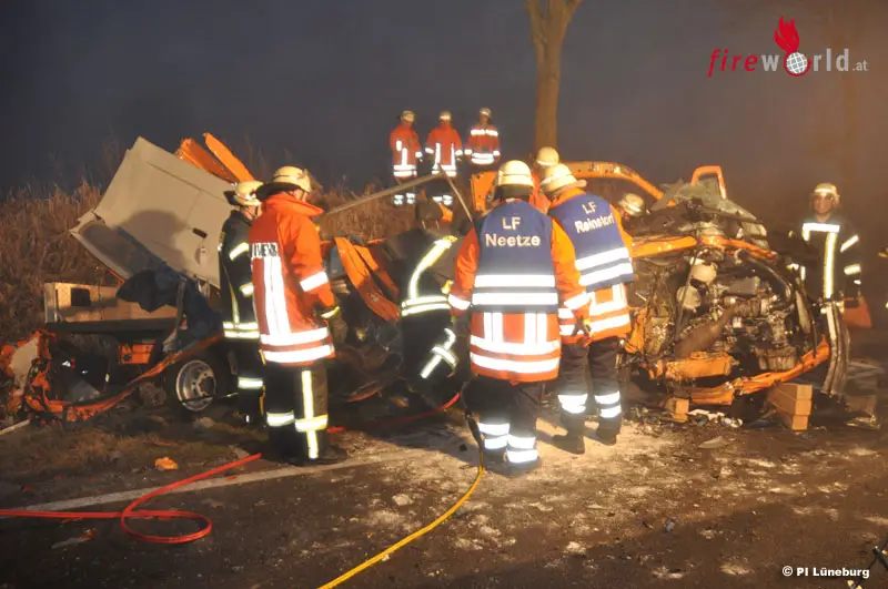 Der Transporter wurde durch die Kollision komplett zerstört. Zwei 49 und 62 Jahre alte Insassen im Transporter verstarben noch im Fahrzeugwrack. Der 51 Jahre alte Fahrer sowie ein 52 Jahre alter Mitfahrer erlitten zum Teil schwerste Verletzungen und wurden ins Klinikum nach Lüneburg gebracht. Der 53 Jahre alte Fahrer des Sattelschleppers blieb unverletzt.