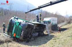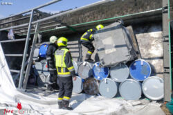 Aufgrund der Lage wurde vom Einsatzleiter das Gefahrenstoff-Fahrzeug der Feuerwehr Telfs nachalarmiert. Als Feststand, dass es sich bei den unbekannten Stoffen um Lösungsmittel handelte, welche leicht entzündlich sind wurde ein dreifacher Brandschutz vorbereitet und nur unbedingt notwendiges Personal zum Unfallfahrzeug vorgelassen. Die Gefahrstoffbehälter hatten den Unfall alle unbeschadet überstanden und wurden vom Entsorgungsunternehmen gemeinsam mit der Feuerwehr geborgen und in einen Ersatz-Lkw umgeladen. Weiters mussten von den Feuerwehren auch noch ausgeflossene Betriebsmittel an den weiteren Fahrzeugen gebunden werden.