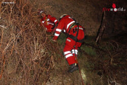 Die Höhenretter-Gruppe begann umgehend zu der Person aufzusteigen und eine Sicherung aufzubauen, damit der Notfallsanitäter die Person erstversorgen kann. Zeitgleich sorgte der Wasserzug dafür, dass die restliche Ausrüstung und Mannschaft an die Einsatzstelle kam und auch das der gesamte Bereich ordentlich ausgeleuchtet wird. 45 min. nach Übungsbeginn konnte das Übungsziel erreicht werden, da die verletzte Person vom Einsatzleiter Rotes Kreuz beim Wasserzug Gebäude übernommen wurde.
