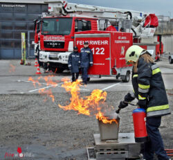 Ein Highlight, wie jedes Jahr, war die praktische Station bei den Kleinlöschgeräten. Mittels Handfeuerlöscher ist von den Prüflingen der Stufe Gold ein Kleinbrand unter Schutzausrüstung nach richtiger Vorgehensweise zu löschen. Diesmal stellte die Betriebsfeuerwehr Voest Alpine Krems ihren Firetrainer zu Verfügung. Hierbei wird mit Gas und einem Steuerelement in einem Metallbehälter ein Feuer simuliert.