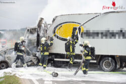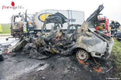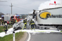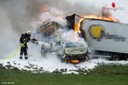 ST. FLORIAN (OÖ): Einen Toten und zwei Verletze hat ein Unfall Dienstagfrüh, 22. März 2016, in St. Florian bei Linz gefordert. Ein Auto und ein Lkw standen nach einem Zusammenstoß in Flammen. Der Pkw-Lenker wurde eingeklemmt und verbrannte.