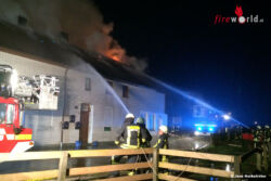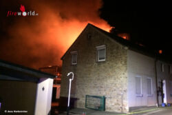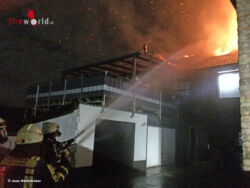 Daher ließ der Einsatzleiter umgehend weitere freiwillige Einheiten alarmieren. Bei Eintreffen der ersten Einsatzkräfte stand der hintere Dachstuhl eines Mehrfamilienhauses bereits in Vollbrand. Die sofort eingeleitete Brandbekämpfung wurde zum Einen mit mehreren Strahlrohren von Außen durchgeführt und zum Anderen gingen Einsatzkräfte unter schwerem Atemschutz in das Gebäude vor.