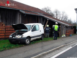Ein Fahrzeuglenker kam im Kreuzungsbereich Bahnhofstraße mit der Spitzgasse mit seinem Kleintransporter von der Fahrbahn ab und fuhr in eine unmittelbar angrenzende, neben dem Gehsteig stehende Scheune. Bei unserem Eintreffen, war der verletzte Lenker bereits von den anwesenden First Respondern aus seinem Fahrzeug befreit worden.