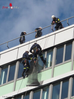 Die zunächst aufgrund der Meldung "Sturmschaden" alarmierte Drehleiter der Feuerwache Münsterstraße stellte bereits kurz nach dem Eintreffen fest, dass die lose Jalousie aufgrund der Höhe im 12. Obergeschoss des Bürogebäudes nicht erreicht werden konnte und forderte umgehend die Höhenrettungsgruppe sowie den zuständigen Führungsdienst der Feuerwache Münsterstraße nach.