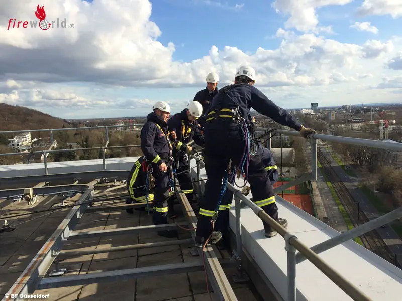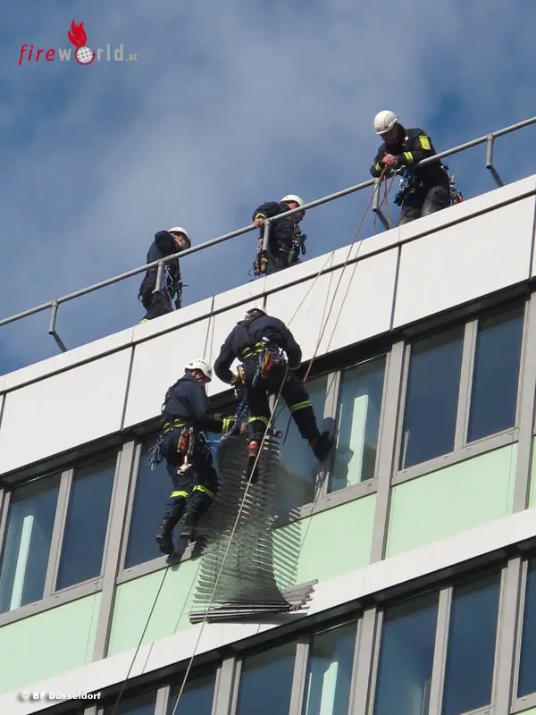 DÜSSELDORF (DEUTSCHLAND): Am Sonntag, 27. März 2016, wurde eine lose Außenjalousie eines Bürogebäudes am Mörsenbroicher Weg in Düsseldorf, die auf den Gehweg zu stürzen drohte, durch die Höhenrettungsgruppe der Düsseldorfer Feuerwehr entfernt.