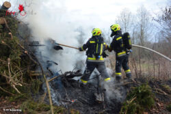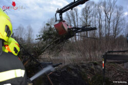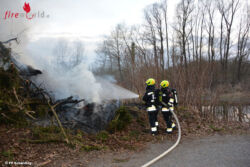 Unter Einsatz von zwei Tanklöschfahrzeugen mit je einem Atemschutztrupp konnte die Brandausbreitung auf den Auwald verhindert und der Brand rasch unter Kontrolle gebracht werden. Um eine komplette Ablöschung zu ermöglichen, wurde ein Holzgreifer angefordert, welcher das Brandgut verteilte. Die Dienstagübung konnte mit einiger Verspätung gestartet werden.